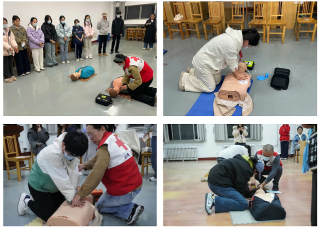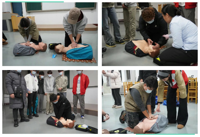培训中,医护人员结合真实案例,讲解了心跳呼吸骤停的快速判断方法,并详细演示了心肺复苏与AED使用的规范操作步骤。在专业人员的指导下,同学们积极上台进行演练,切实掌握了相关急救技能。部分同学通过后续考核,为取得初级救护员证书打下坚实基础。