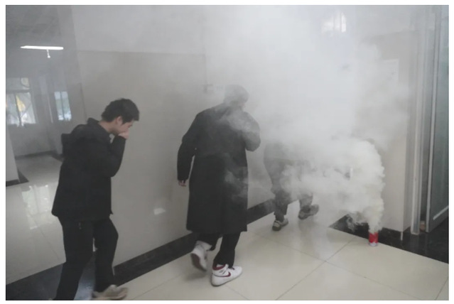 警报响起后,宿舍楼内模拟烟雾弥漫,应急疏散演练正式开始。各楼层辅导员迅速组织学生沿疏散路线有序撤离,学生捂住口鼻、弯腰低姿,行动迅速。