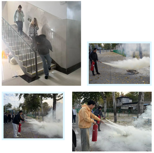 疏散至操场后,学生在辅导员指导下学习灭火器的使用方法,并按照“一提、二拔、三瞄、四压”的步骤进行实操训练。