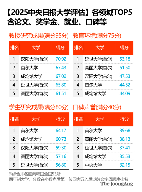 在2025年中央日报大学综合评估中,首尔大学继续保持第1位。自排名中排除理工科大学后,首尔大学已连续10年位居榜首。继去年之后,延世大学(首尔校区)继续保持第2位,而去年排名第5位的汉阳大学(首尔校区)升至第3位。高丽大学(首尔校区)和成均馆大学(首尔校区)则分列第4位和第5位。前五名之间的分差为9分,较两年前的27分缩小至三分之一。在各大学努力提升研究与教育实力的推动下,竞争力提高、差距缩小的“整体水平上升”趋势愈发明显。
