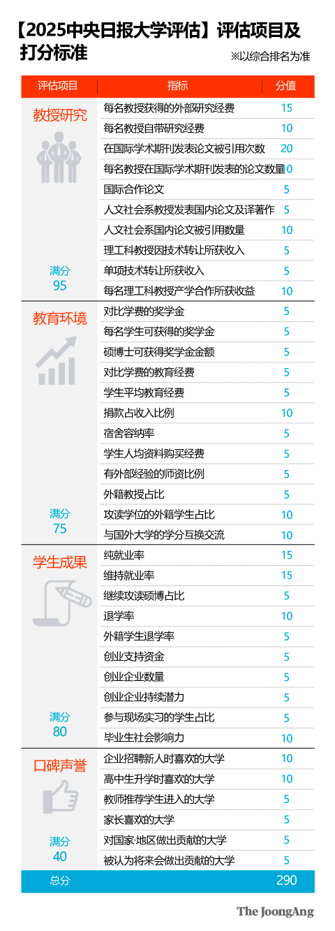 综合评估由教师研究(10项,95分)、教育条件(12项,75分)、学生成果(10项,80分)、声誉(6项,40分)等4大领域的共38项指标评分,满分为290分。今年扩大了去年引入的“毕业生社会影响力”中人物范围,利用中央日报人物信息DB进行统计,在创业指标中加入最近3年学生创业企业的销售额,以反映其质性影响力。
