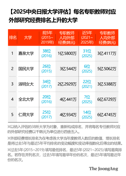 通过十余年持续扩充优秀师资,嘉泉大学在2025年我报“成长型大学评价”中位居榜首。该评价首次分析大学中长期发展程度,对38所持续参与评价的大学,以过去5年(2015-19年)与近5年(2020-25年)的平均排名,测算各校上升幅度与增长率。以教授人均外部研究经费、全职教师SCI国际论文数量、国际论文被引频次(FWCI)、就业率、持续就业率(一年以上保持就业)、中途放弃率、声誉度、留学生比例(在校生中外国留学生占比)等8项指标作为评估标准。