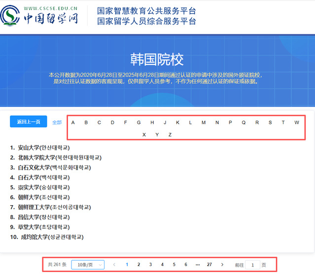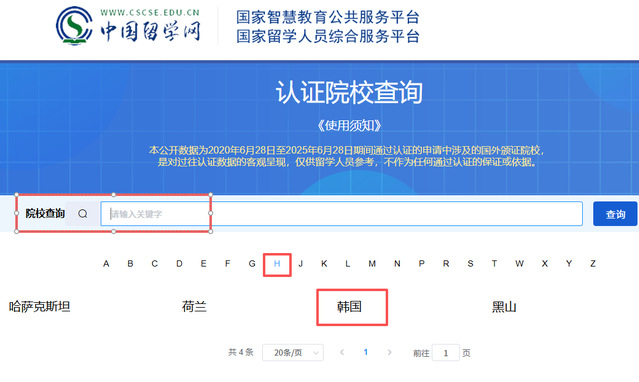 3.查询是否为认证院校方法一:可以在搜索框直接搜索院校名进行查询;方法二:选择字母“H”,进入韩国院校界面,根据院校第一个字的拼音进行点击查询。
