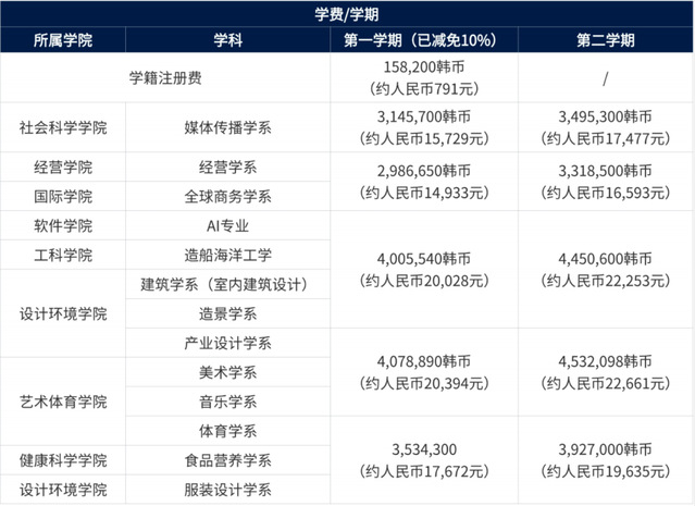 学校费用(金额为每学期费用,采用2025年标准,会根据汇率浮动、具体专业分类及学校要求有所变动)