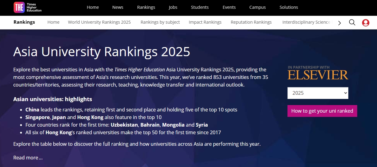 近日,国际教育资讯领域权威机构泰晤士高等教育(Times Higher Education,简称THE)公开最新版亚洲高等院校评估结果。2025年泰晤士高等教育亚洲大学排名共有来自35个国家/地区的853所高校上榜,较去年31个国家/地区...